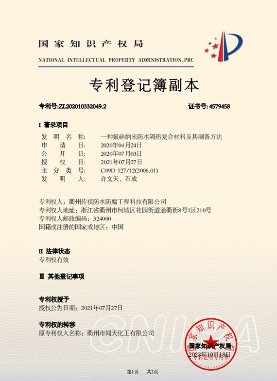 衢州傳祺新材料科技有限公司是衢州市聞天化工有限公司的下屬企業(yè);衢州市聞天化工有限公司成立于2003年,是國(guó)內(nèi)最早研發(fā)、生產(chǎn)氟碳涂料的企業(yè)之一。衢州傳祺新材料科技有限公司成立于2017年,公司專注于高分子氟材料的開發(fā)和含氟材料在防腐、防水領(lǐng)域的應(yīng)用。經(jīng)過(guò)6年的不懈努力,已獲得了化工和建筑領(lǐng)域六項(xiàng)國(guó)家發(fā)明專利授權(quán)和兩項(xiàng)新產(chǎn)品科技成果獎(jiǎng),參與了中國(guó)建筑材料流通協(xié)會(huì)《房屋修繕?lè)浪こ桃?guī)范》標(biāo)準(zhǔn)的編制工作,中建協(xié)涂裝委員會(huì)浙西工作站設(shè)立在我公司。